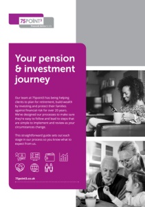 Your pension & investment journey Our team at 75point3 has being helping clients to plan for retirement, build wealth by investing and protect their families against financial risk for over 20 years. We’ve designed our processes to make sure they’re easy to follow and lead to steps that are simple to implement and review as your circumstances change. This straightforward guide sets out each stage in our process so you know what to expect from us. 75point3.co.uk